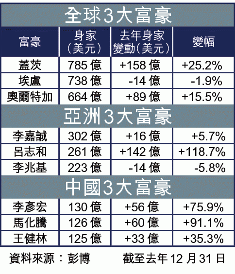 其中微軟創辦人蓋茨重上榜首,身家暴漲158億美元(約1,230億港元),成為最大贏家;亞洲區方面,李嘉誠蟬聯亞洲首富,而銀娛(027)主席呂志和去年身家激增1,100億港元,進佔亞洲第二富豪。