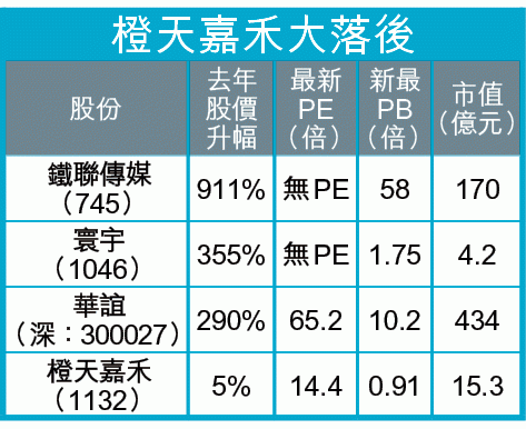 ★橙天嘉禾去年幾乎無升幅,今年有望來個大報復。股價即使升1倍,估值仍是人家的零頭,甚至零頭的零頭。