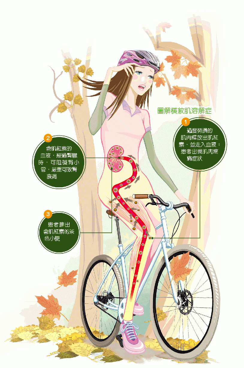 身體長時間做重複動作,如跑步、舉啞鈴、做掌上壓、踩單車;甚至參與馬拉松及三項鐵人賽等耐力運動,若訓練不足,也可致橫紋肌溶解症。陳解釋,當肌肉勞損至壞死,不能即時復元,橫紋肌(即包住骨骼的肌肉)內一種物質「肌紅素」會流入血液,令血液的肌酸酵素比正常高五至十倍不等。患者會出現周身肌肉疼痛、小便呈茶色症狀,肌紅素會傷害腎臟細胞及阻塞腎小管,嚴重可致腎衰竭。