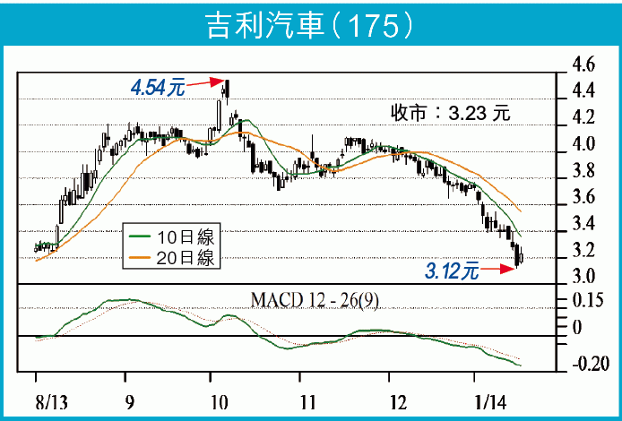 吉利上周連挫3日原因之一,是花旗與高盛先後將其目標價調低至3.90元與4.73元,但以高盛由原本目標價5.20元降至4.73元計,仍高出現價46%,與本欄目標價4.57元相差4%。