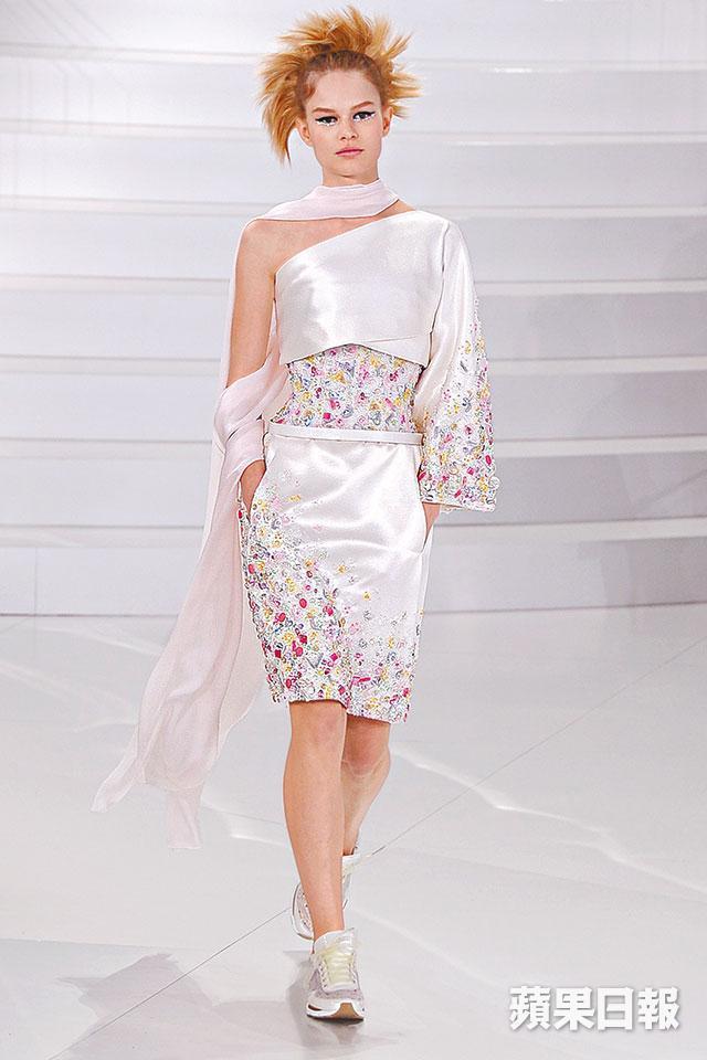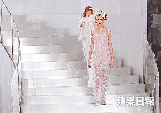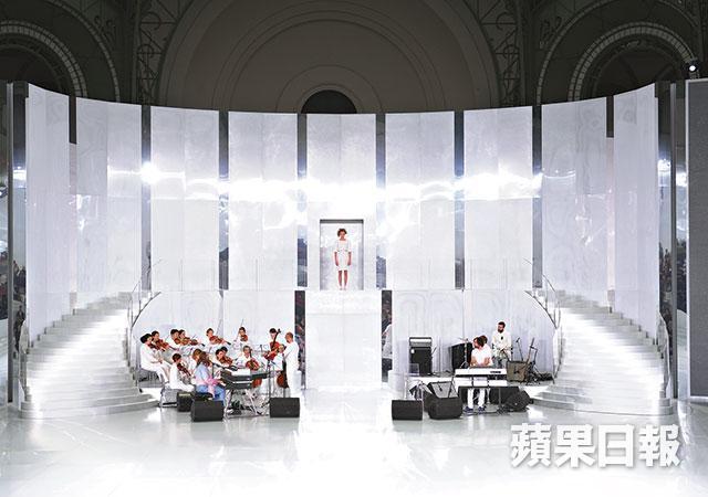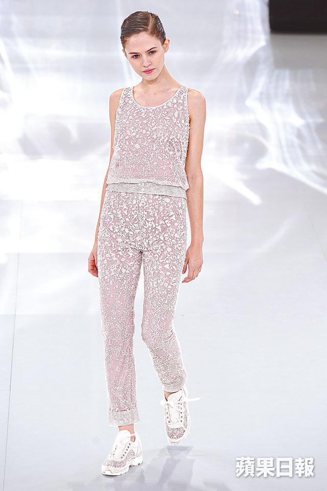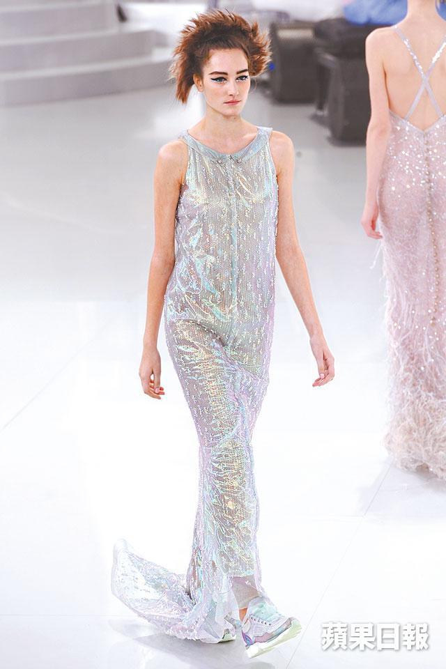 法國殿堂的Chanel最為大龍鳳及創意的高級訂做服舞台,永沒令人失望。香港時間前日傍晚在巴黎大皇宮搭建充滿未來主義的Cambon Club舞台,兩邊白色圓拱形樓梯、銀色旋轉舞台、VIP房長梳化、弦樂與電子結他的現場演奏,65個模特兒腳踏蕾絲刺繡跑鞋,以跳蹦蹦輕快步伐帶出couture的運動跳脫感。