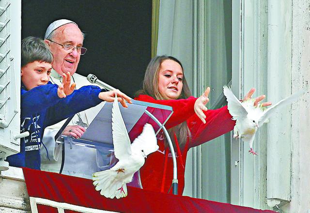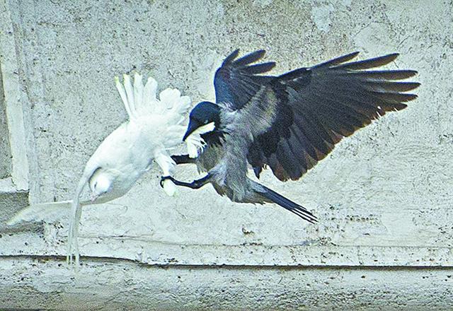 教宗方濟各(Pope Francis)前日(周日)在聖伯多祿廣場主持彌撒,為烏克蘭和平禱告後,兩名小童將兩隻象徵和平的白鴿釋放,豈料白鴿拍翅高飛之際,卻立即遭到海鷗及烏鴉突襲。教宗為烏克蘭反政府示威中喪生的人士及家屬禱告,呼籲雙方進行對話解決分歧,之後協助兩名小童釋放和平鴿,怎料白鴿甫拍翼,其中一隻被從高空飛撲而下的海鷗啄住幾條羽毛,撞向外牆,甩掉幾條羽毛,另一隻和平鴿則遭烏鴉襲擊,幸好兩隻鴿最後成功逃脫,令廣場上的信眾都鬆一口氣。 英國《每日郵報》