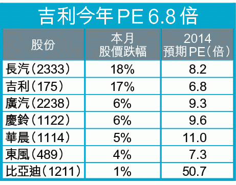 1)吉利執行董事李東輝前日在EGM後表示,去年出售汽車54.9萬輛,增長14%,勝過整體市場,預測2014年增長6%。本欄認為,以此等數字計算,吉利估值過低。