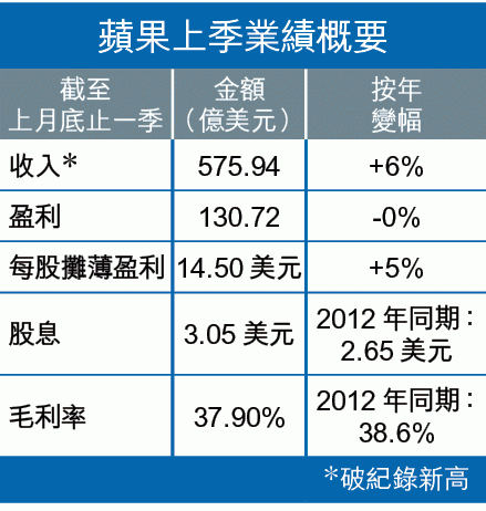 iPhone繼續為蘋果收入增長引擎,該公司上季售出逾5,100萬部iPhone,創紀錄新高,但遠低於市場預期的5,500萬部,銷售額錄324.98億美元。iPad銷情亦破紀錄,售出逾2,600萬部,銷售額114.68億美元。