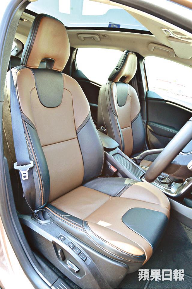 至於車箱內櫳,佈局基本上和普通版V40如出一轍,最大改動是換上two-tone顏色座椅,無論是前排和後排座椅,均包覆了啡搭黑的真皮,與啡金色的車身非常配襯,細心觀察,連真皮上的車線也選用類近的啡色車線,進一步強化視覺上的對比度及和諧感。雖說佈局一樣,但如有用心找不同,還會找到一些凸顯Cross Country版本身份的地方,如副駕駛座前首飾箱上的電鍍裝飾,便印上了「Cross Country」字樣,另加入了特大全景式天幕,加強內櫳空間感。唯一要挑剔的是,後排座位依舊有頂頭問題,高個子會坐得辛苦點,作為標榜跑長途的旅行車,難免有點失色。