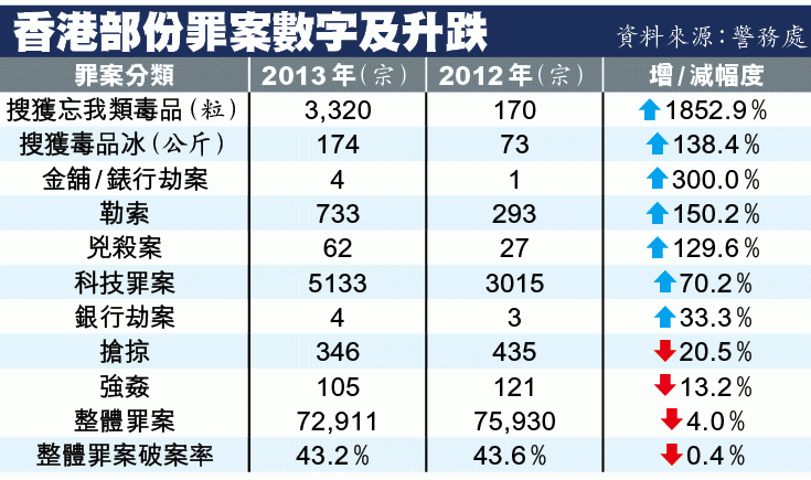 警方去年全年共接獲72,911宗罪案,比前年下跌4%,破案率微跌0.4%至43.2%,大部份罪案有下降趨勢,但青少年涉嚴重毒品罪案不跌反升,其中10至15歲涉販毒被捕的人數激增近一倍,有95人。