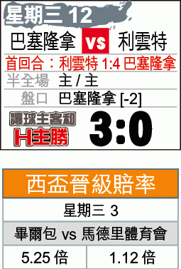 周三西班牙盃8強次回合,巴塞隆拿將迎戰利雲特。雖然巴塞首回合已經領先4:1,但他們今屆西盃主場比賽例牌大炒,加上巴塞往績佔壓倒性的優勢,所以今場照捧巴塞「讓球主客和」[-2]「主勝」!(球賽編號:星期三12;now632台明日5:00am直播)