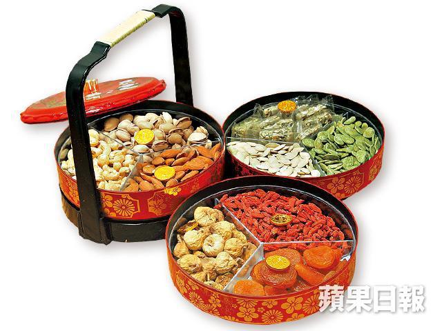 她用的是三層高的全盒,為了母親,選購小食以健康為首要考慮,分了三大類:堅果、乾果及瓜子。堅果類有腰果、開心果及杏仁,均選擇沒加鹽份的原味,貪夠香口;乾果類有杏脯、杞子及她最愛的無花果乾,要選擇表面較乾爽、甜度較少的,取其顏色鮮艷,味道清甜開胃;瓜子則是不經色素處理的原味白瓜子、綠茶瓜子及瓜子酥,保留傳統之餘,有別於常見的紅黑瓜子,別有新鮮感。「過年食物一般不太健康,多油多鹽多防腐劑,自己好為食,不願戒口,便盡量找較健康的取代。」