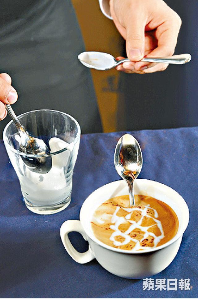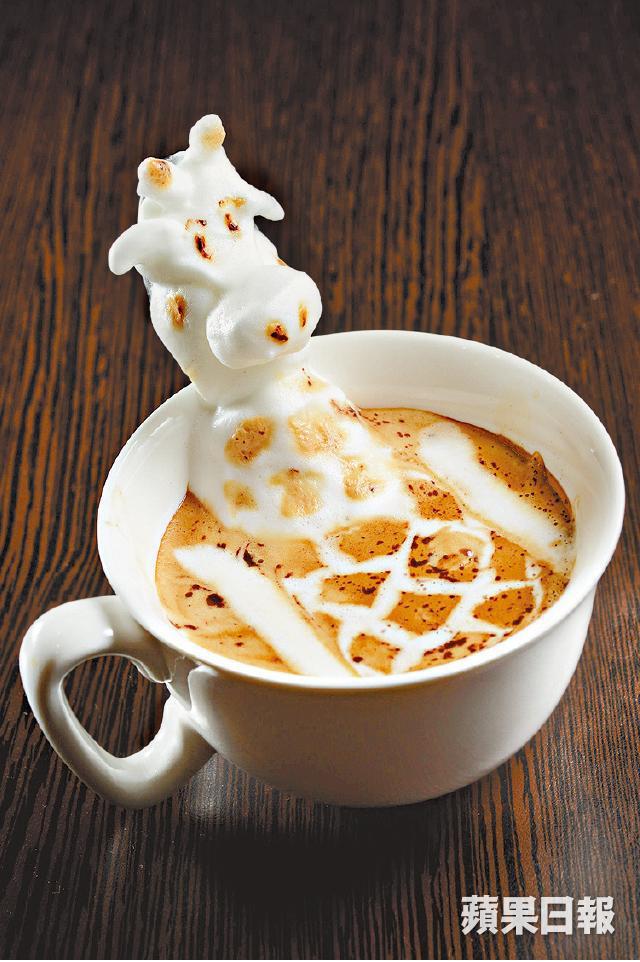 以面層奶泡在咖啡面畫上長頸鹿紋圖案,插入匙羹。