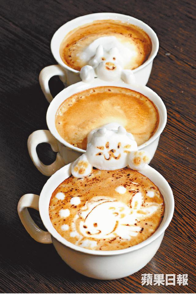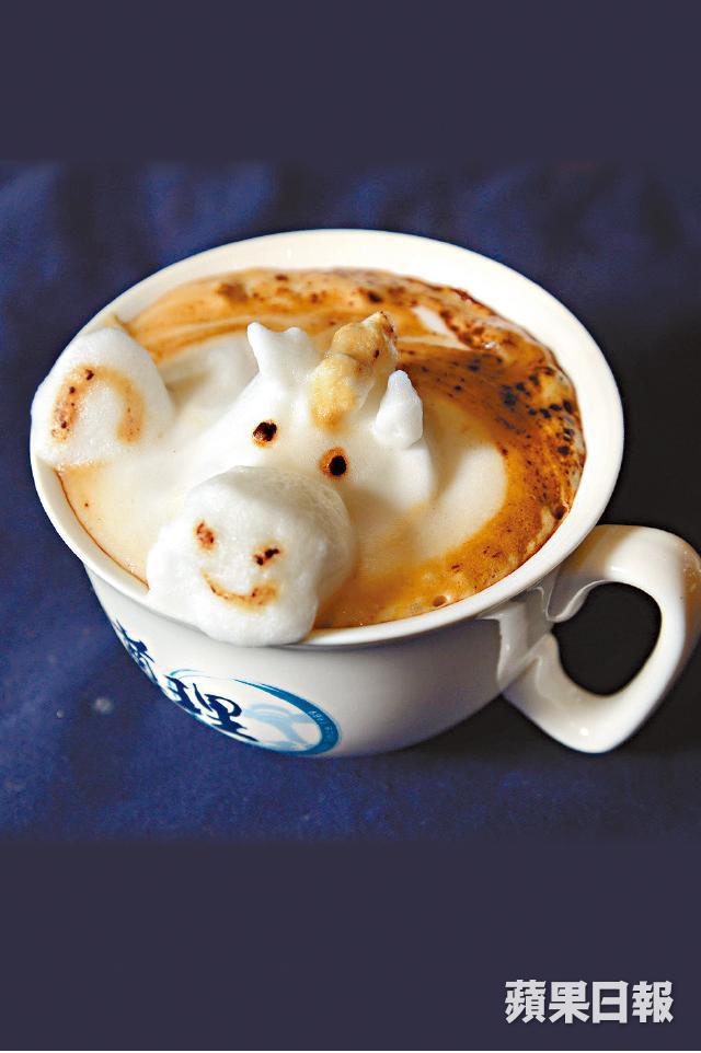 奶泡輔匙羹三個球狀,逐個放在匙羹上,以雞尾酒針加上奶泡做成耳及角,最後加咖啡於頸部紋理及五官即可。