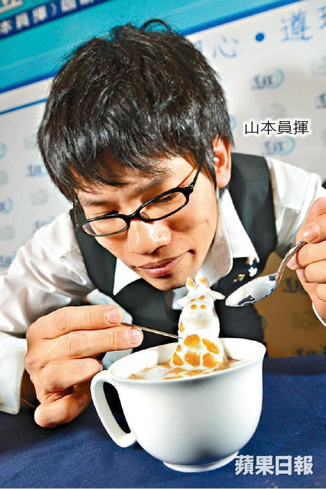 浸浴中的長頸鹿、橫跨着兩隻杯的貓咪……試問哪位少女不被山本員揮的3D Latte Art迷倒呢?原以為他是位把妹高手,怎知這位27歲的男子,面對着可愛的女士竟然會面紅、緊張、口齒不靈,所有宅男的徵象統統出現。單靠一杯咖啡找不到自己的姻緣,卻撮合了不少男女,他坦言曾為顧客做出求婚、求愛拉花,結果如何,他並沒有深究,只是繼續埋首於他的Latte Art。這位男版紅娘最初只是位平面拉花的愛好者,兩年前心血來潮下,將奶泡做成可愛的兔仔,只是失敗了三次,兔仔便成功浮於咖啡上,他用相機拍低放上Twitter,立時被朋友大讚:「卡娃兒呢!」於是便立下決心,繼續設計出不同的3D Latte Art。山本員揮笑言當時已被勝利沖昏頭腦,已忘記了咖啡的味道如何,只記得腦海中不停盤算着下一次的圖案。