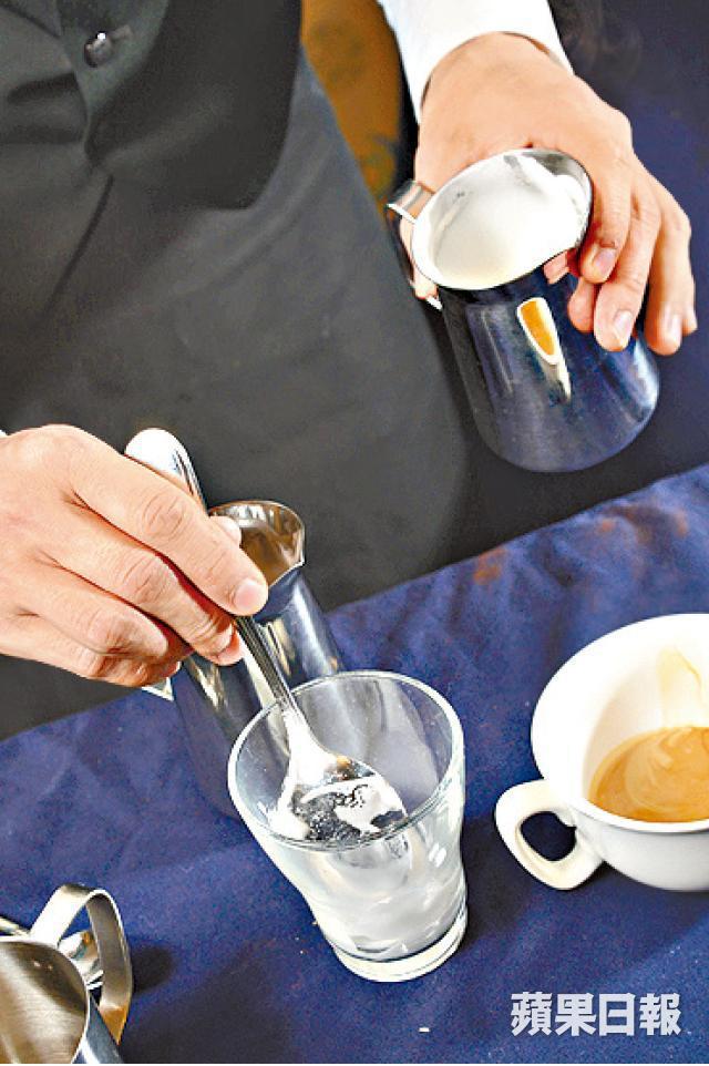 打好鮮奶,閒置約兩分鐘。將面層奶泡盛起於另一杯中,底層奶泡留用。
