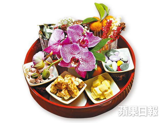 「這幾年總找不到合心意的全盒,加上全盒一年只用一次,要用地方存放,不太環保,自己平日四圍旅行,最喜歡行雜貨舖,尋找靚碗碟器皿,所以新年不需另買全盒,用回現有的餐具便可。」曲奇四重奏、Smile Yogurt & Dessert Bar的合夥人關琬潼(Shadow)說。她每年會用各類碗碟設計獨一無二的全盒,像兩年前用的是數隻釀有金邊的英式茶杯,而近年因鍾愛日本文化,首次將研究多年的日式花藝加入「全盒」——最當眼的紅色托盤,原來是插花用的「草月流」花盆,中間位置放上數朵淡紫紅的蘭花,用在京都購買、由女陶藝師所做的器皿載着,旁邊圍繞的分別是在沖繩購入、鑲有金邊的一套四隻小碟子,還有法國品牌Lalique的水晶蠟燭臺及Baccarat法國水晶杯,漂亮得很。別以為她只是隨手排放,「中間刻意選用高身的器皿,是不想花碰到食物,而選用高低不一的杯子,亦可製造層次感。」眼前這個全盒,將有生命力的花朵融入全盒中,構成一個活生生的藝術品。