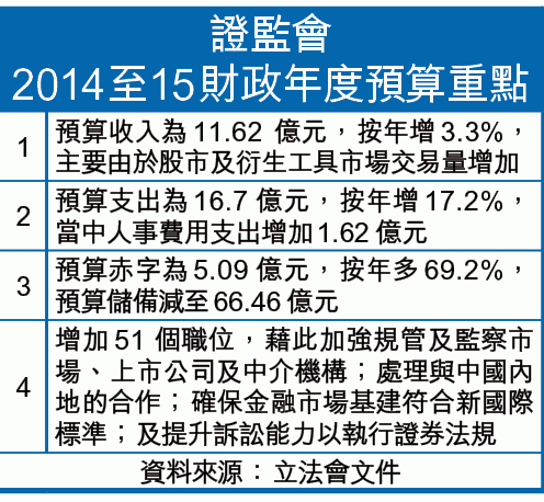 根據證監會交予立法會的最新財政年度預算文件顯示,證監會預計截至今年3月底止將錄得3億元的赤字,惟已較最初預算的4.35億元赤字為少,整體儲備達71.55億元。在下一財年,證監會預計支出會大增17.2%至16.7億元,料整年將錄得5.09億元赤字。