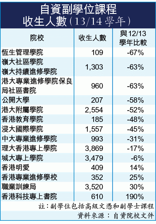 職訓局專業教育顧問梁任城表示,該校資助和自資副學位學額共有1.29萬個,本學年大致達標。他指自資院校本學年收生人數下跌是意料中事,而自資學士學位課程增加也搶去部份學生。