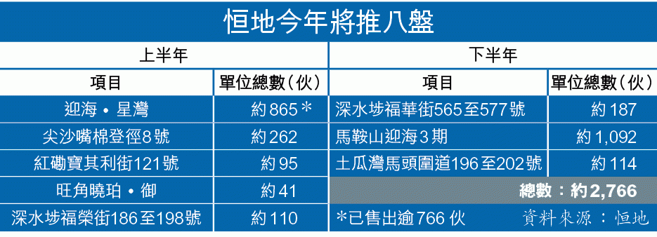 林達民稱,今年屬「多盤開」年份,恒地今年銷售目標「保守啲」,目標160億元,與去年相若。恒地計劃今年推出八個新盤(見表),總實用面積約165萬方呎,共約2,766伙。恒地去年售出2,000多伙,套現逾165億元。尖沙嘴棉登徑8號共260伙,有望成為恒地馬年頭炮。馬鞍山迎海3期共1,092伙今季申請售樓紙,下半年推出。