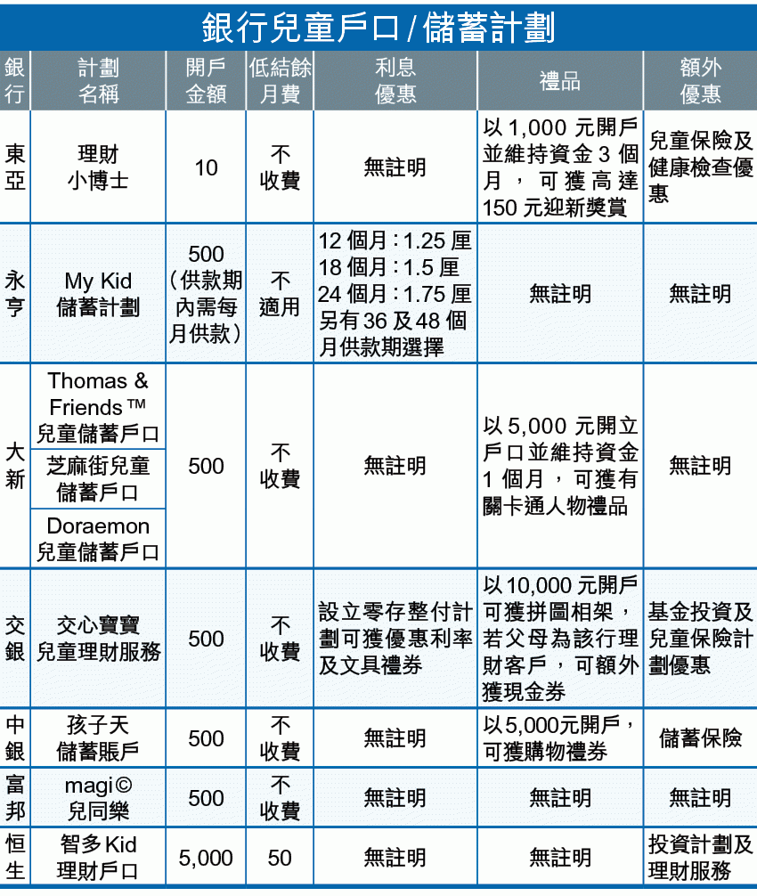 多數銀行在兒童儲蓄戶口之上,亦另設儲蓄計劃、儲蓄保險或基金等投資計劃,息率則因金額或選用計劃而定,未有劃一準則。若家長有意為小朋友「先儲未來錢」,可向銀行查詢。