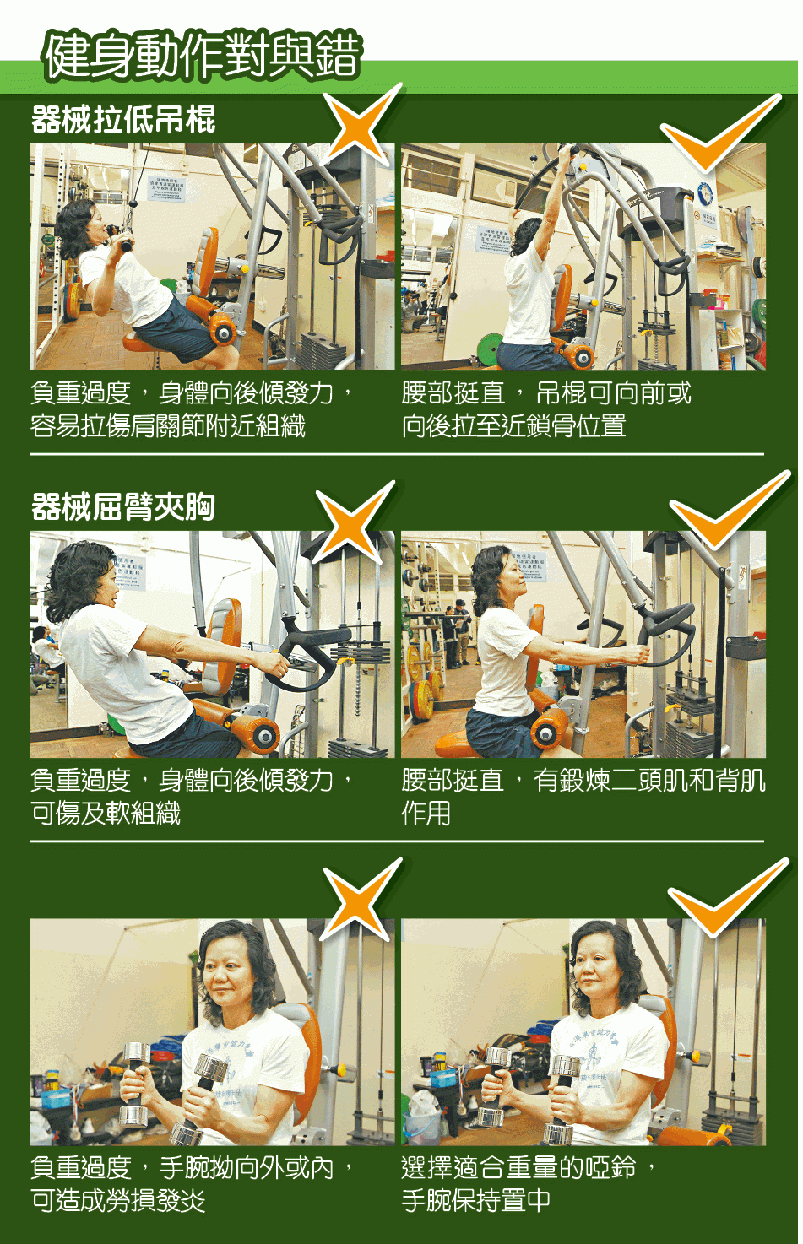 不同的健身動作可鍛煉不同部位的肌肉,例如坐着利用器材屈臂夾胸的動作,可鍛煉二頭肌和背肌。葉永玉說,選擇了適合自己的負重,屈臂夾胸時腰部便能挺直;相反若負重過度,身體便會為發力而搖擺或向後傾,結果無法練肌之餘,更會傷及軟組織,或令腰背過勞。坐着拉低吊棍的動作,同樣需要選擇適合負重,否則便會錯用頸部發力,容易拉傷肩關節組織。
