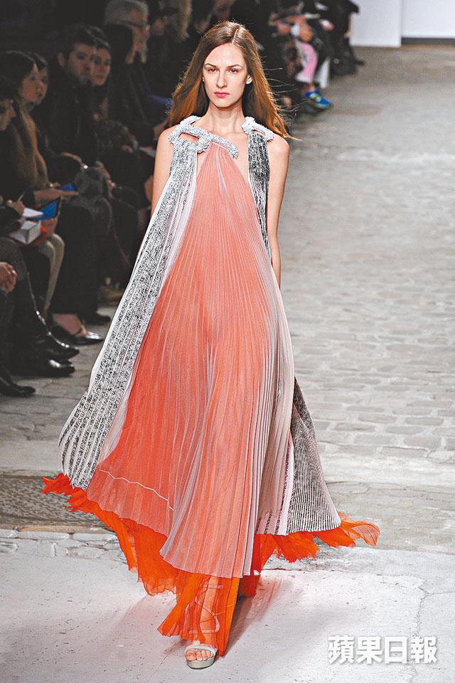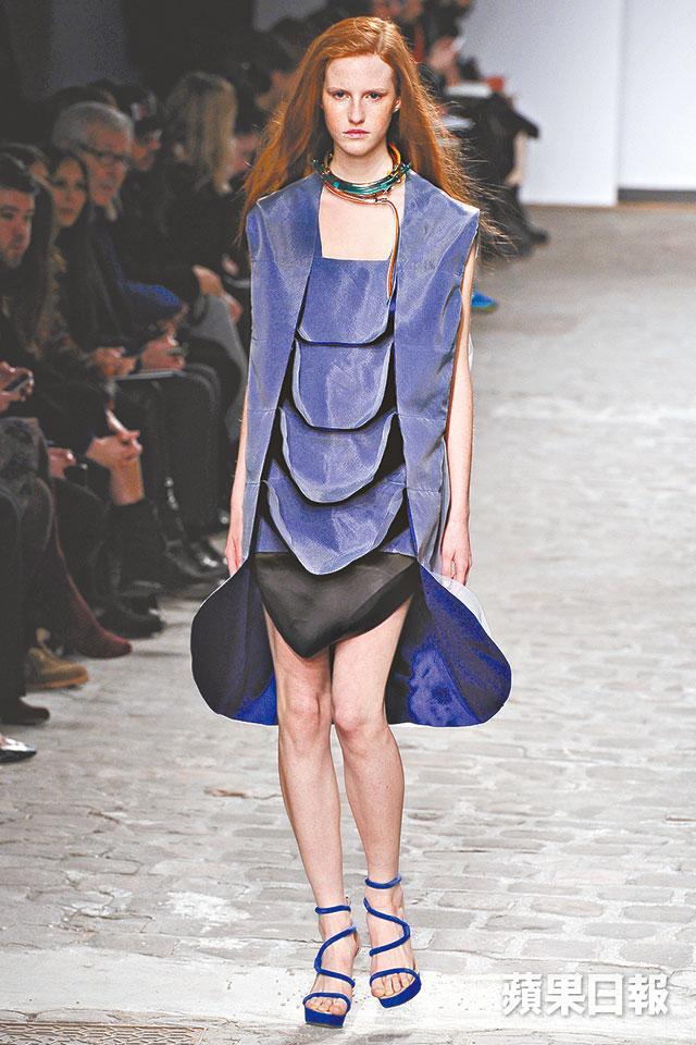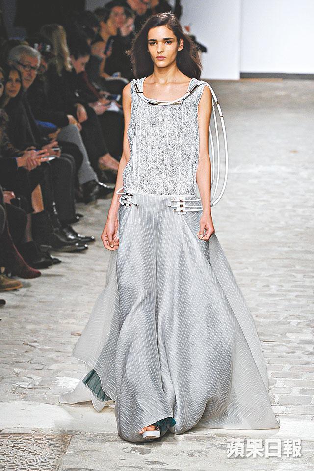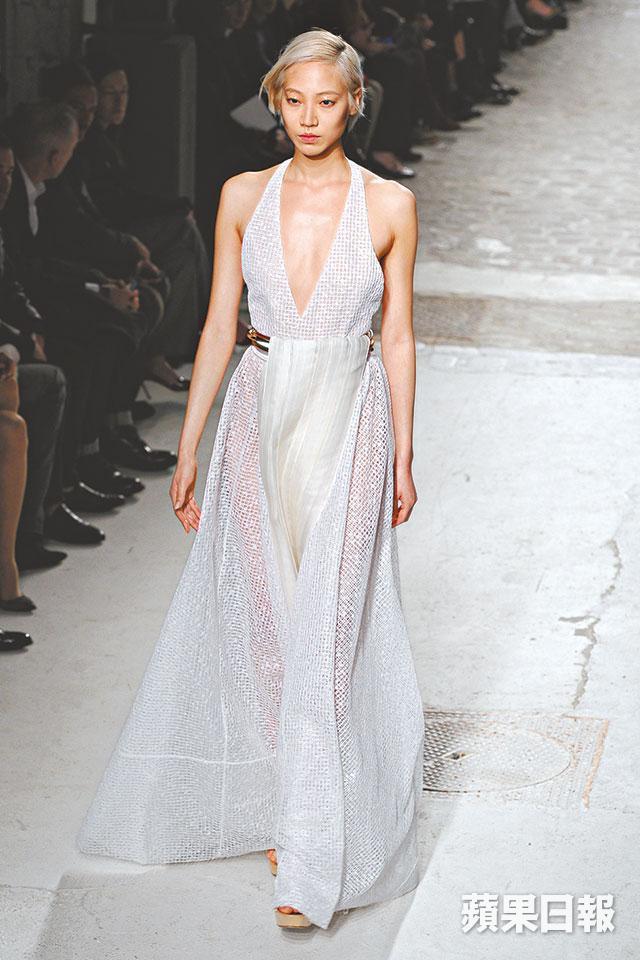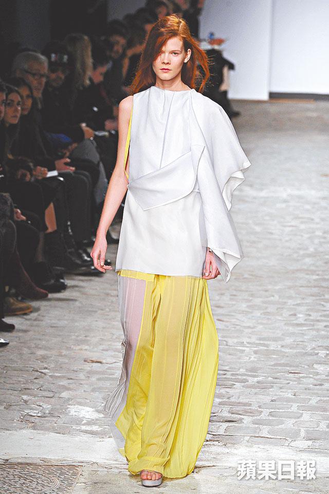 【巴黎直擊】法國老牌Vionnet上季加入高訂時裝周行列,2014春夏找來設計師Hussein Chalayan操刀,設計有着過去的bias cut、百褶、泡泡紗細節,並加入以電線轉化成的幼身腰帶及釘珠頸飾等工業元素,帶來新世代電氣化的女神美態。