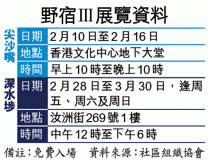 社協下周一起第三次舉辦露宿者相展「野宿III」,並出版同名圖文集訴說露宿者的故事,喚醒有心人關注他們的困境。資深攝影記者雷日昇義助社協追蹤露宿者生活十多年,樂見社會意識增強,惜政府仍以無情措施,掩蓋房屋政策失衡帶來的惡果。前特首曾蔭權07年出席「野宿II」開幕禮,便在鏡頭後說:「原來香港有咁多露宿者?」雷期望藉展覽帶動政策改變。社協組織幹事吳衛東促政府重推廉租市區單身人士宿舍。