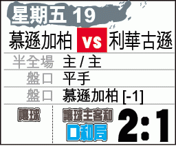 慕遜加柏在歇冬後戰績急跌,兩戰皆敗後於積分榜由第3位跌至第5,周五德甲獨腳戲主場迎戰利華古遜不容再失分。慕遜加柏在今季的主場表現始終信得過,迎戰利華古遜有全取3分本錢,今場開出平手盤下,更加捧得過。(球賽編號:星期五19;有線61及201台明日3:30am直播)