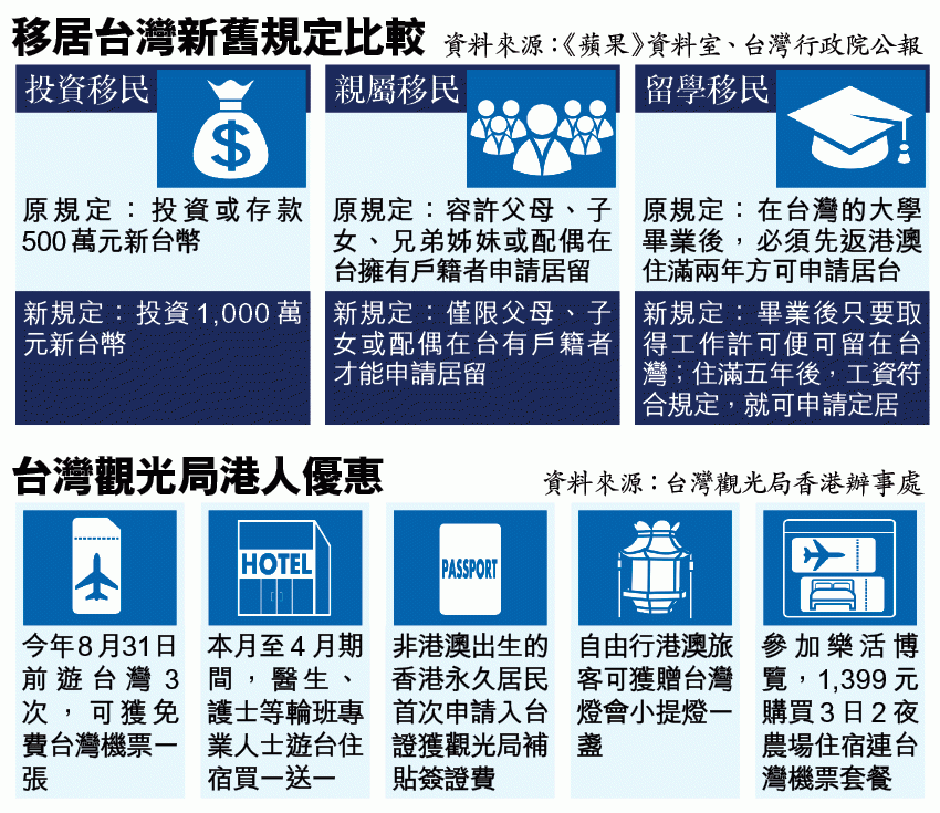 【本報訊】特首梁振英上台後香港急速撕裂,真普選不知何時兌現,不少港人已移居早已實現民主的台灣。不過台灣為了控制人口,行政院最近已修改移民法,收緊港、澳居民移民台灣的規定,包括將原有存款或投資500萬元新台幣的要求,改為必須投資1,000萬元新台幣(約256萬港元),又刪除兄弟姊妹或配偶之父母在台有戶籍者的申請資格;不過,為留用年輕人才,當地放寬在台留學的港澳學生畢業後定居的限制,料今年3、4月實施。