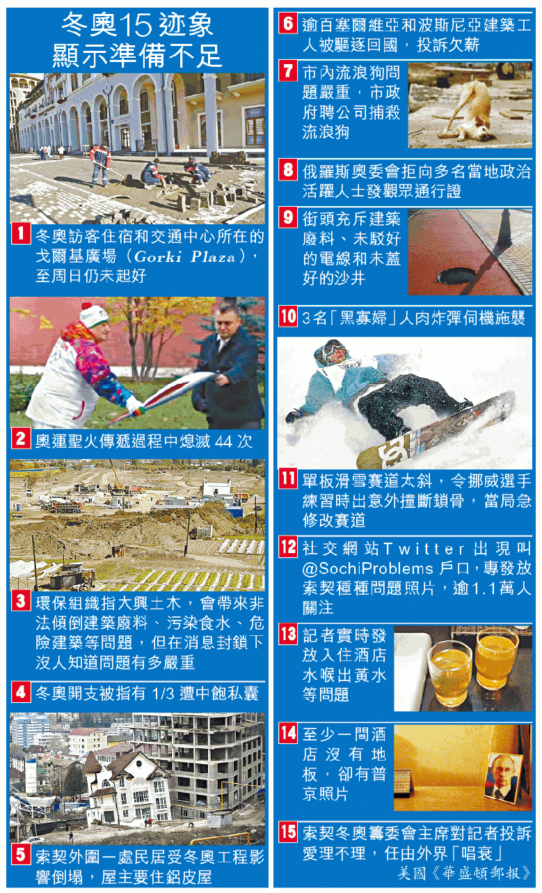 索契市中六座新建場館、俄羅斯最大的火車站等新建設,都建造得很壯觀。不過記者見識了酒店房間的萬事不備後,紛紛爆粗。市內道路連沙井也缺乏足夠鐵蓋蓋好,隨時令人跌落洞中,一名英國承辦商說,人們教他「見泥氹千萬不要踩。」各場館和酒店一帶的樹木,都是臨急植下的,要用繩拉穩。