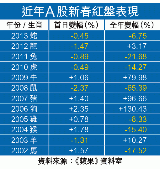 另外,本報統計過往12年滬綜指於春節後首日表現(見表),發現最近8年,有7年滬綜指春節後首日與全農曆年表現方向相同,換言之,根據往績,滬綜指首日升,全個農曆年多數升,反之亦然。例如2013年蛇年首日僅跌0.45%,全年則只下滑6.75%。至於2008年鼠年首日下跌2.37%,全年則重挫65.39%。以此往績推斷,馬年首個交易日象徵意義甚大,或預示全年表現。