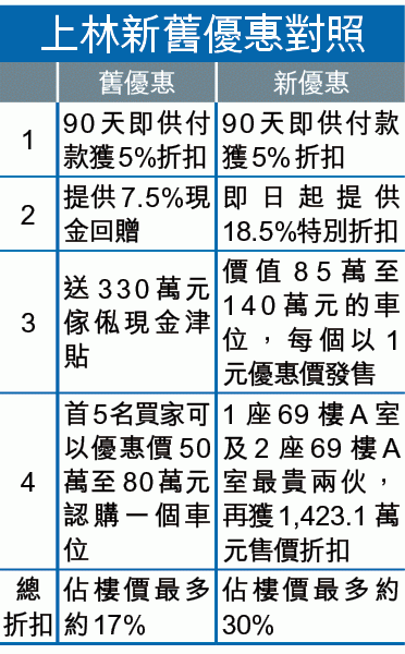 自從政府實施BSD及DSD雙辣招後,趕絕內地大款及投資者,打殘豪宅,而多個一手豪宅新盤如尖沙嘴天璽等先後劈價促銷。去年7月首度重售的上林,自從在去年8月售出一伙後,至今未聞成交。發展商有見銷情慘淡,決定將優惠加碼,總折扣優惠由最多約17%增至約30%。