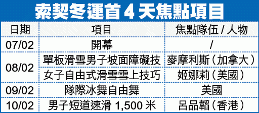 今屆索契冬運今日揭開序幕,到本月23日結束。美國、德國及挪威是冬奧的傳統強國,但在上屆溫哥華冬奧,加拿大靠主場之利力壓德美挪而成為贏得最多金牌的國家,故外界亦相信於上屆僅得3金的俄羅斯,有力重振雄風。今屆其中一個看點是男女子花樣滑冰,其中貌似本港歌手方力申的俄羅斯冰王子普斯辛高(小圖),將與加拿大的世錦賽3冠王陳偉群作正面交鋒。