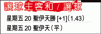 往績方面, 圖盧茲主場也未見佔優,他們近6次迎聖伊天3勝3負,勢均力敵,所以今仗看好客隊今場坐和望贏。若果嫌「讓球主客和」[+1]「客勝」太熱的話,不妨轉吼「讓球」平手盤,聖伊天值博。文:咖喱