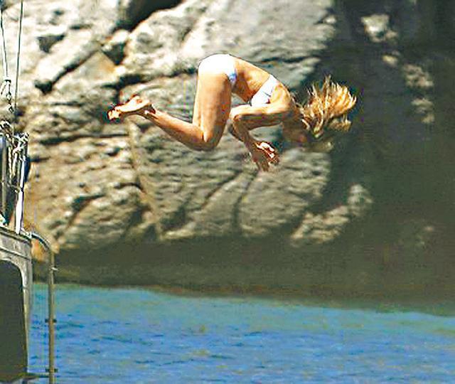 不過自信爆棚的金美侖一於少理,繼續與同行的多位猛男戲水。金美侖多次玩跳水樂不可支,又大玩花式,360度翻騰入水,表現得有板有眼。現時單身的金美侖與一眾猛男玩得相當過癮,而她跳完水上船時,男伴更望到金美侖的屁股實一實,可見雖然有橙皮紋,但金美侖依然魅力非凡。