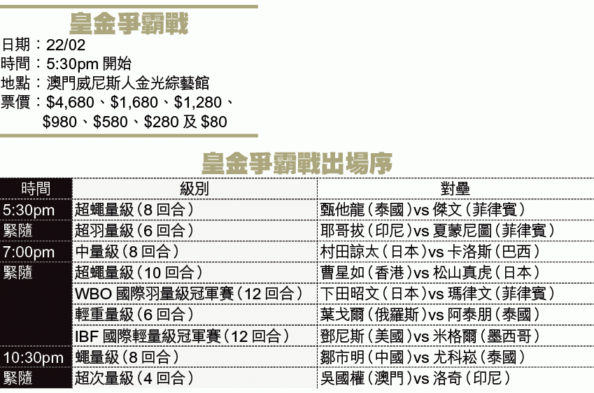 今日「皇金爭霸戰」的座位,由去年11月有菲籍拳王帕奎奧坐鎮下開足13,000個,到今日只開7,000座位,星如說:「我一向不會怯場,不管場地大細,我只會集中自己的比賽,對手話要在5個回合K.O.我,我不會露出破綻,若他露出破綻,我一定不會放過(早段K.O.對手),但我已做好打足10回合的準備。」星如賽前獲得一個喜訊,就是墨西哥一專播拳擊的電視台,將會在美國及墨西哥當地直播今日前4場比賽(見附表),包括星如一場比賽。