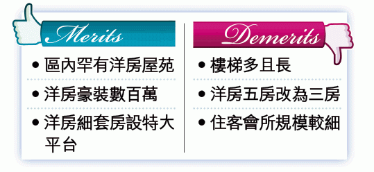 一樓間隔改動頗大,由原來三房改為兩房。細套房最吸引,外接曲尺形大平台,佈置彈性高,向西南望屋苑內園景致。套房原本無衣帽間,現向偏廳偷位增建。雖然原來的偏廳位置縮小,但另一個接連長形平台的房間,則將牆身拆走,變身較大的偏廳,可以擺放曲尺形梳化,招呼朋友共敍。
