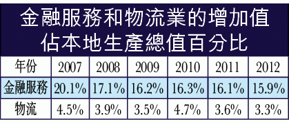 筆者認同成立未來基金的目的,但始終倚靠投資收入是有一定風險,因為投資環境可以風雲突變,一旦基金不能獲取預期回報,政府財政穩健性便會出現問題。若要真正減低結構性財赤的可能性,最王道的方法是提升本地主要產業的賺錢能力。但事實是香港的經濟「四大支柱」包括(1)金融服務、(2)貿易及物流、(3)旅遊,和(4)專業服務及其他工商業支援服務,尤其是金融服務和物流業在近年已出現老化(附表),如果要繼續倚靠「食老本」來支持香港的長遠經濟增長實在不夠穩妥。