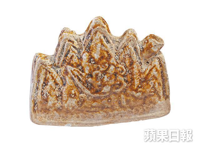 這個唐彩筆山是靳埭強收藏中最古舊的一件筆山,兩面均具山的風景,其中兩個山峯中藏有一洞口,古人用作盛水,方便在郊遊途中,詩興或畫意大發時,可即時倒水沾墨寫詩繪畫。
