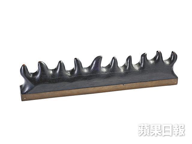 這件筆山具九個山位,可同時放上九支毛筆,上部以紫檀雕成不同形態的山峯,並以白銅成底,可作紙鎮,是靳埭強80年代後期,在北京潘家園舊貨市場覓得,當年索價已過千。