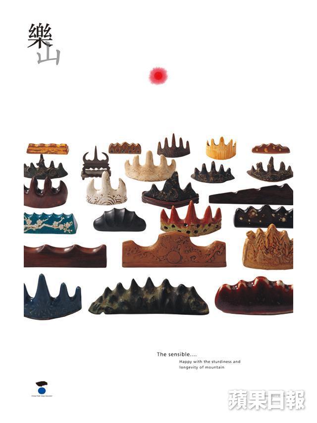 筆山具生活美感,他在設計中不時將其加入其中,使用得最多的一次,是二〇〇〇年為日本一個以「快樂」為主題的海報設計活動,使用二十四件筆山作道具,「快樂是甚麼?在自然環境中,『樂山』便是快樂,筆山本身是一座山,將它們放在一起便成,當然我要排列出它們最美的位置。」靳埭強笑着說。海報設計簡單直接,群山在太陽當下,而這一點紅的太陽是承傳老師呂壽琨的畫風,「這是對恩師的致敬和紀念,一九八五年為紀念老師離世十周年而舉辦的作品展,我首次使用老師的蓮花『一點紅』為海報的設計元素。」一九八九年開始將「一點紅」加以發展,時而代表太陽,時而為大自然的傷痕,「十多年來運用這點紅離不開老師的框格,直至將這點紅發展為母親的乳頭,將地球與母體融合,代表地球是人類的大地之母,呼喚世人愛護我們的地球。它感動了世界各地的參觀者,這次成功轉型讓我非常開心。只要合適,也會把這點紅放進去,希望每次也賦予新的意思。」兩年前靳埭強已慶祝從心之年(七十壽辰),活現學到老設計到老的大師風範。