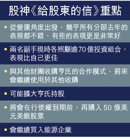 至於巴郡去年與其他財團收購亨氏(Heinz)的合作模式,「股神」指可作為範本,將來會繼續使用於其他收購;與此同時,來年可能會擴大亨氏持股,令巴郡對該公司有更大掌控權。