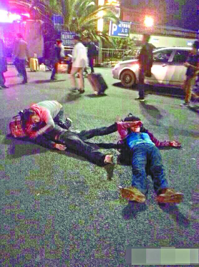 歹徒是新疆維族人,約有20多人,有男有女,他們統一穿黑衣,手持刀具,衝進火車站廣場、售票廳,見人就斬,包括現場執勤警察,也中刀倒地;一時間血濺四周,哭喊聲四起。