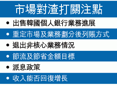 除業績外,證券界普遍更關注渣打的重組進展。當中出售韓國貸款組合料為焦點之一。法巴香港金融研究部主管陳志銘表示,外界關注渣打將如何節流及節省金額目標,集團已表明撤出拖累表現的韓國零售銀行市場,聚焦企銀發展,他說去年上半年,渣打在當地零售銀行的未償還貸款,按半年比較已縮減13%(其中按揭減18%),估計去年全年,其韓國零售銀行貸款餘額將按年跌兩成。