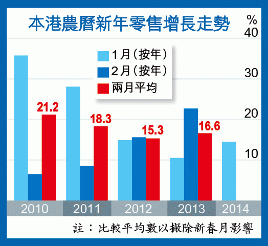 以去年為例,農曆新年在2月份,該月零售增長達22.7%;2011年農曆新年所在的1月份,增長更達28.1%。麥瑞琼續指,「今年2月份一定差過1月份」,估計1、2月平均消費增長只有10%,「開年開得差,嚟緊幾個月消費淡季,零售商一定要好辛苦咁追」。