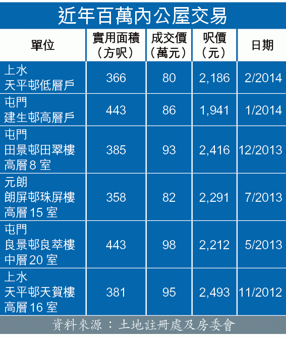 政府狂推地,無論新盤及二手樓均出現減價潮,公屋率先跌穿百萬,成為上車佳音。房委會昨公佈,天平邨一個實用面積366方呎低層戶,上月以80萬元免地價售出,料平絕近年全港公屋;實用呎價低見2,186元,創屋苑2012年2月以來新低。