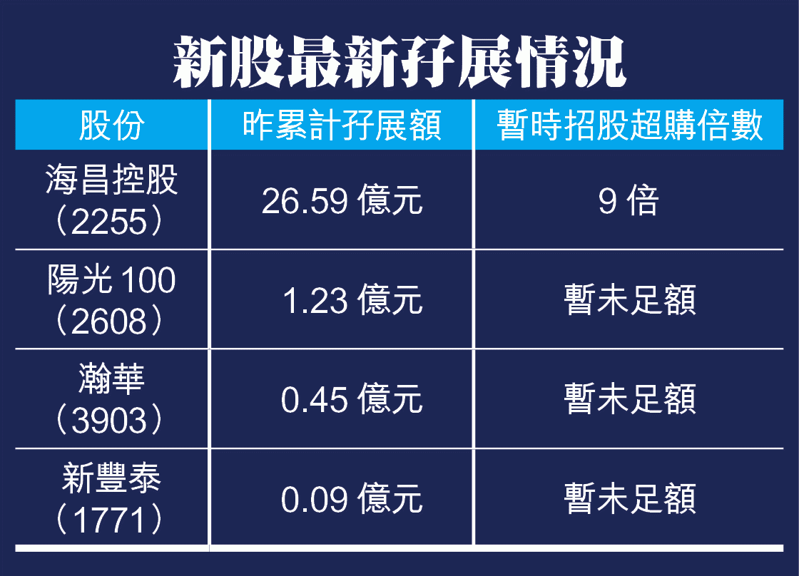 綜合8間證券行資料,第二日招股的內地海洋主題樂園營運商海昌控股,昨日累計孖展額錄26.59億元,較上周五的53.5億元,大減近27億元或五成,超購額由19倍縮至9倍;其餘內房股陽光100(2608)及小額貸款企業瀚華(3903),孖展分別錄1.235億元及4,500萬元,只微增2%;豪華汽車經營新豐泰(1771)則錄880萬孖展,惟三股公開發售均未足額。