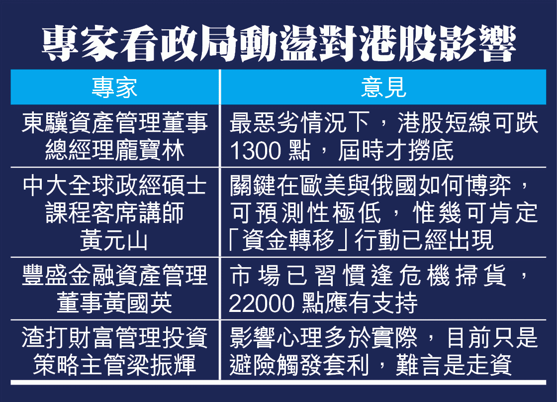 雖然烏克蘭對港股負面影響並不直接,但專家認為不能小看其效應。中大全球政經碩士課程客席講師黃元山強調,烏克蘭局勢關鍵在於歐美與俄國如何博弈,「視乎佢哋係以牙還牙、定十倍奉還」,可預測性極低,惟幾可肯定「資金轉移」行動已經出現,並有機會是將新興市場的早前的兩波走資潮「延續」,一日政局不明朗,市場仍要面臨巨額波動。