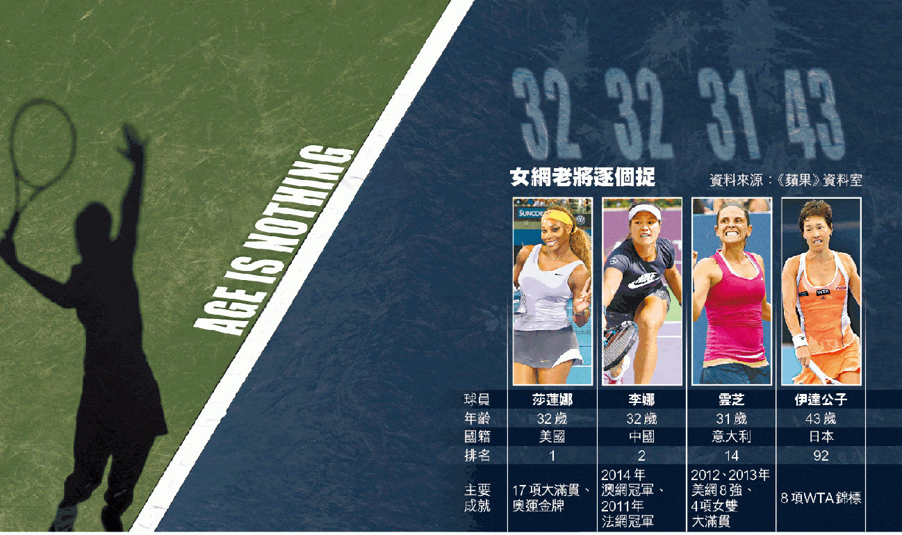 至於最傳奇老將則要數日本的伊達公子。闊別網球壇超過近12年的她,自從08年復出後便積極參與各大小比賽,當中在09年的南韓公開賽更成為史上第2老的WTA錦標冠軍。她亦於13年改寫澳網歷史,創下最年長女單球手取得勝仗的紀錄。現年43歲的她是世界排名頭100內最年長的球手,比第2老的大威年長近10歲。