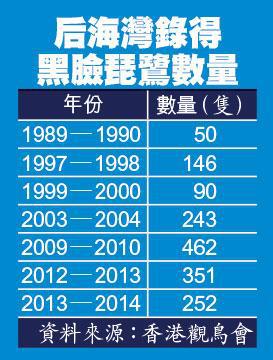 香港觀鳥會研究經理余日東指,自2000年起,橫跨港深兩地的后海灣一直是全球第二多的黑臉琵鷺過冬棲息地,2010年曾錄得最高峯462隻,惟自此每年下跌,去年被中國大陸沿岸追過,今年再被日本超前,跌至第四位。