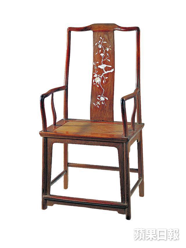 官帽椅是因為其外形像古代官吏所戴的帽子而得名,而這張官帽椅最具特色之處,是靠背鑲嵌揚州的周制工藝。明朝晚期,有一名叫周翥的工匠,他非常有名,原因是他不嵌螺鈿,而是專門鑲嵌各類名貴材料,如金、銀、寶石、珍珠、珊瑚等百寶,由於周翥名氣太大,這款百寶嵌也被稱為周制。馮耀輝購買這椅子時,靠背的裝飾已遺失,現在看見的鑲嵌是由珠寶藝術家陳世英復修的。