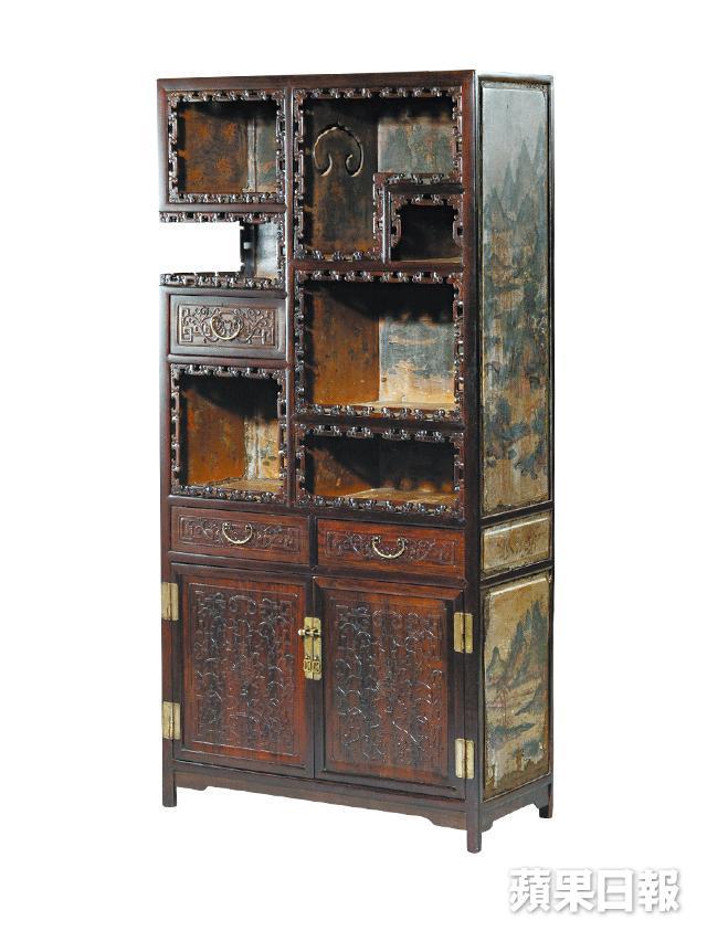 整個櫃子不論正面、櫃旁、櫃背、櫃桶及內壁的所有面,均有黑漆描金,估計是清宮廷用品,縱然部份描金及木材已脫落,仍不失高雅。