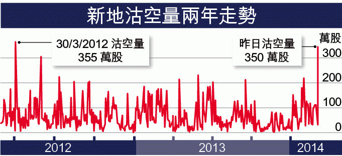新地昨日裂口低開近2%,收市報96.65元,跌2.67%,市值單日蒸發近71.7億元。有基金經理表示,由於新地是次是向每名股東發出認購證,故機構投資者翌日先行為持倉進行技術性對沖,導致新地沽空量激增,拖低股價。新地昨沽空量350萬股,沽空金額為3.4億元,是自2012年3月、郭氏兄弟被廉署調查以來的新高,沽空比率38%。